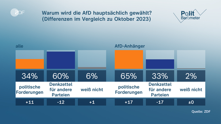 In der klassischen Sonntagsfrage zeigt sich ein ähnliches Bild: Die AfD verbessert sich um einen halben Punkt auf 27 Prozent. Die Union kommt nur noch auf 24,5 Prozent, ein halber Punkt weniger als letzte Woche. Die Linke (elf Prozent) und BSW (4,5 Prozent) legen jeweils einen halben Punkt zu, die Grünen verlieren denselben Anteil und kommen auf elf Prozent. Die FDP bleibt stabil bei vier Prozent.