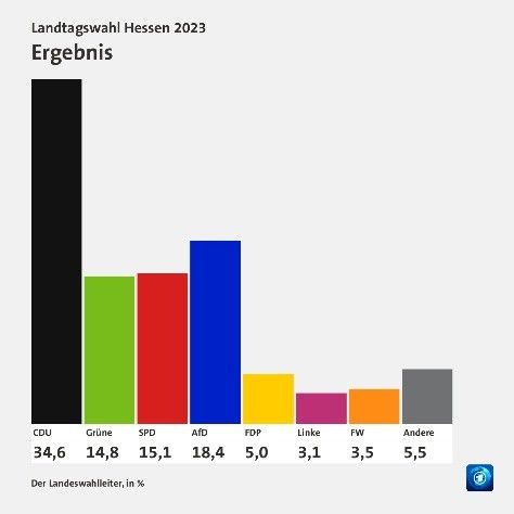 Die AfD bleibt mit 18 % die zweitstärkste Kraft und führt weiterhin die Oppositionsfraktionen im Wiesbadener Landtag an. Die Grünen verbessern sich auf 14 %