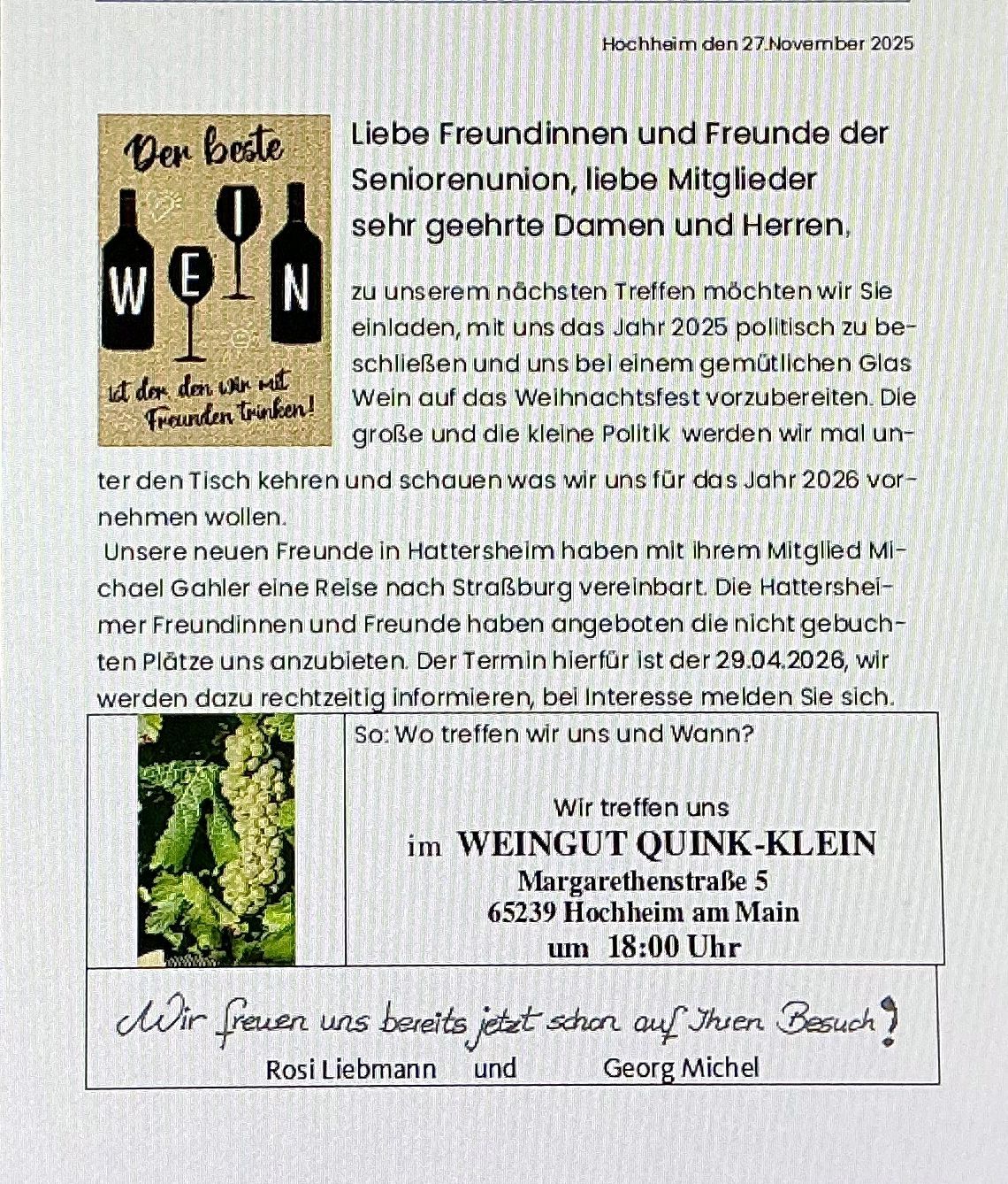 Im kommenden Jahr besteht die Senioren-Union in Hochheim 25 Jahre. Dies soll in einem würdigen Rahmen gefeiert werden.